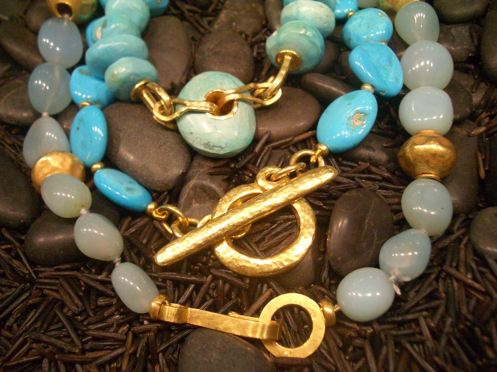 American Indian jewelry has long been a personal passion; so many of her pieces incorporate turquoise with 22k gold. Andrea says that the color turquoise is happy and coordinates well with any color in one's wardrobe.